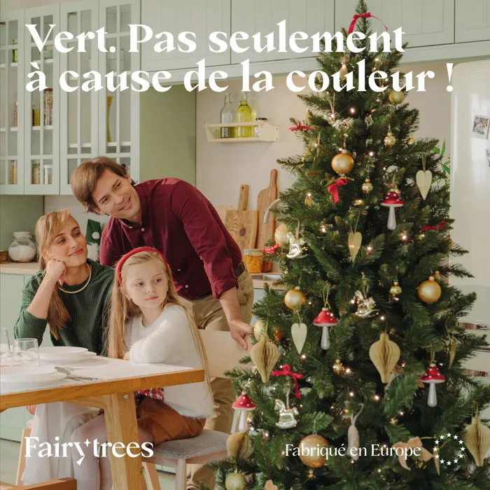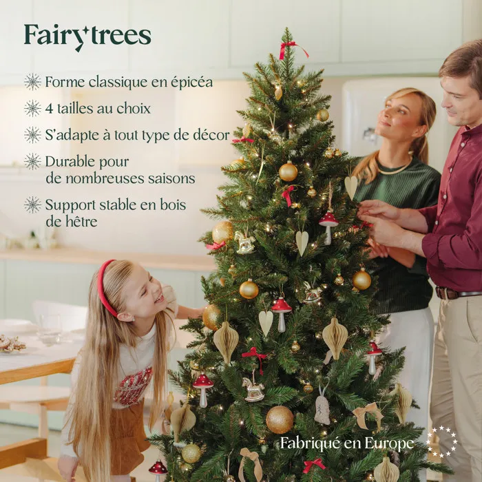 Árbol de Navidad artificial FairyTrees de 180 cm de abeto natural | Árbol de Navidad con soporte de madera | Tronco verde | Fabricado en la UE
